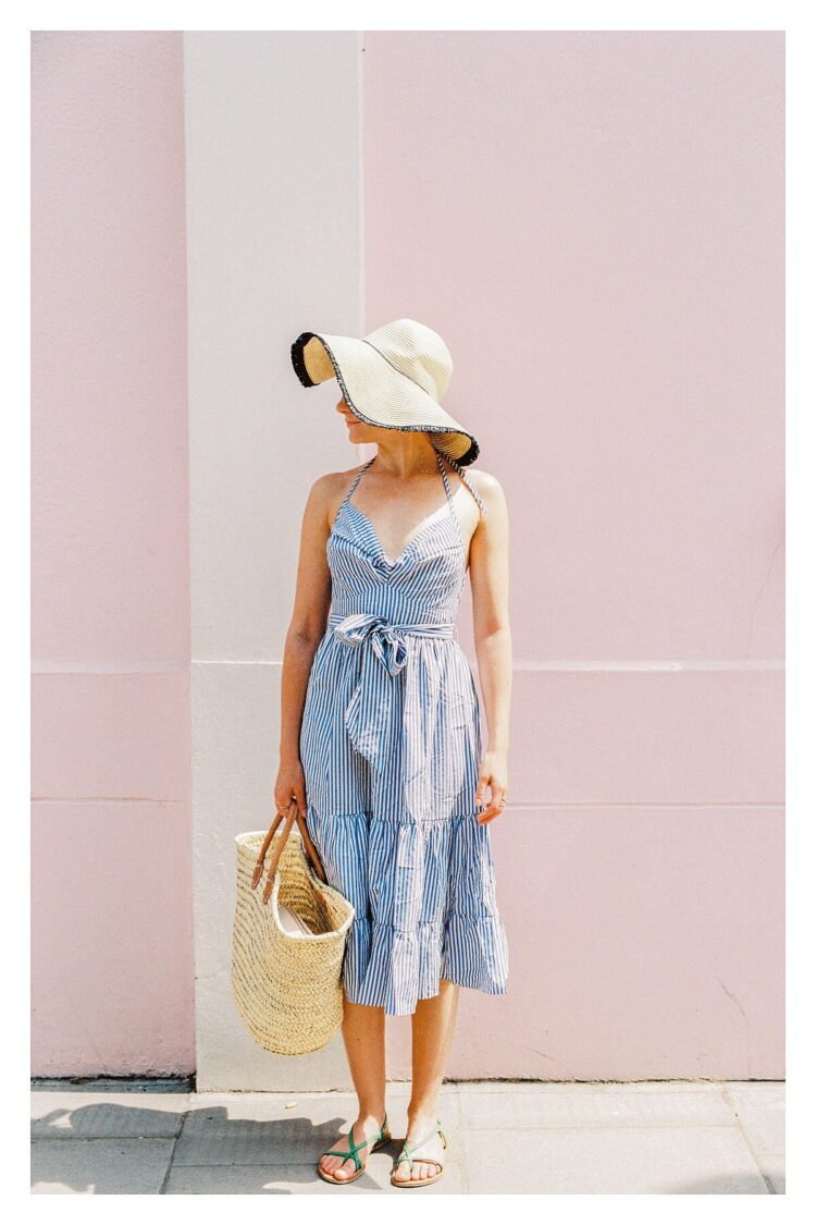 A woman in a striped summer dress waits beside a pink London building, basket in hand—a quiet moment of anticipation captured on 35mm film.